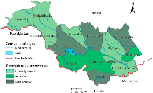 However, many factors impact recreational industry, and water-related features are one of the most important as the changes in river regimes pose risks for the population and recreational essentials such as infrastructure. Climatic conditions such as temperature and humidity, shape the water-conditions such as quality, water and ice levels. This has been increasing during recent decades. They measured the hydro-environmental tension and recreational attractiveness for each protected area in Altai, then compared the data.