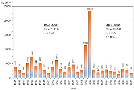The largest share of fires caused by lightning in the total number of fires occurs in the latitude interval 60–65° N, which is about 39%. At higher latitudes, it decreases along with a significant weakening of thunderstorm activity. At the latitudes 65–70° N, the proportion of fires caused by lightning in relation to the total number of fires is about 21%