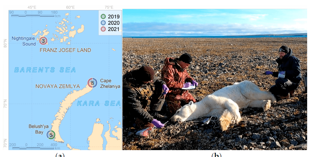 The researchers expected to find changes in bear gut microbiome. They chose 3 archipelago sites to analyse – Franz Josef Land and two sites of Novaya Zemlya. They collected samples from Franz Josef at the beginning of the seasonal ice melt and Novaya Zemlya during the ice melt. They observed the bears with satellite data for a few days beforehand then immobilised bears so they could collect the samples. They measured sex, body mass as well as time, temperature and other environmental measures. They recorded observations such as fat deposits and observable health condition.